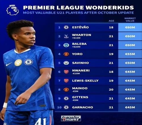 英超U21球员身价榜: