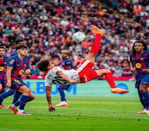 雷速体育10月19日宣 本轮西甲,维特塞尔在对巴萨的比赛中打入漂亮的倒钩进球,一度将比分追平,但最终赫罗纳还是1-2输给了巴萨。