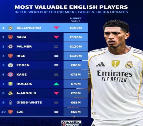 北京时间12月13日,在更新了英超和西甲球员的身价之后,德转列出了目前英格兰球员身价TOP10,贝林厄姆1.6亿欧元第一,萨卡1.3亿欧元第二,帕尔默和赖斯同以1.2亿欧元并列第三位。